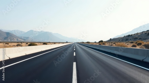 Fototapeta premium Asphalt road stretching towards distant mountains under a clear sky, bordered by low concrete barriers and arid shrubbery