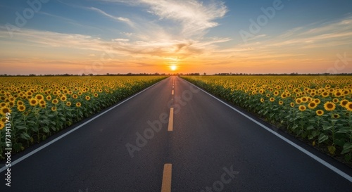 © ROY, Naklejka premium Asphalt road through a sunflower field at sunset