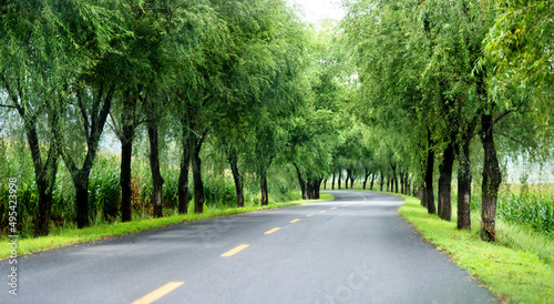 © xy, Fototapeta premium Asphalt road through green field in summer day