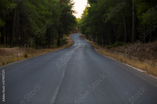 Obraz premium Asphalt road through green pine forest
