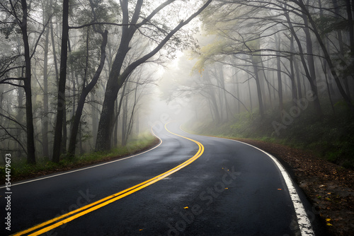 © Kymaka28, Fototapeta premium Asphalt Road Through Misty Forest with Yellow Center Line