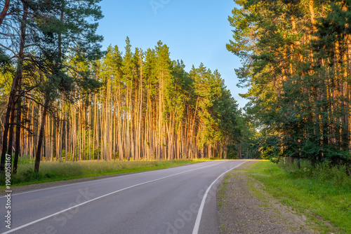 © Nekrasov, Fototapeta premium Asphalt road through pine forest in golden sunset light