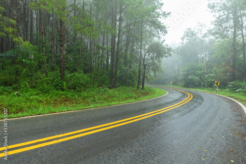 Fototapeta premium Asphalt road through the forest in rainy season