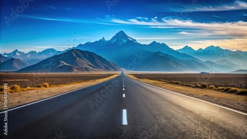 Fototapeta premium Asphalt road vanishing point towards majestic mountain range under a vibrant sky