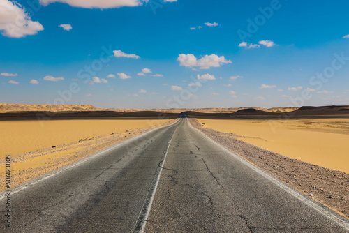 © Dave, Fototapeta premium Asphalt Road View of the White Desert Protected Area in the Farafra Oasis, Egypt