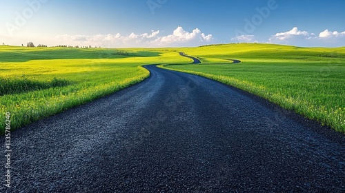 Obraz premium Asphalt Road Winding Through Verdant Fields Under a Blue Sky