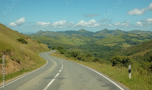 © Yopi, Naklejka premium Asphalt Road Winding Through Verdant Valley Under Blue Sky