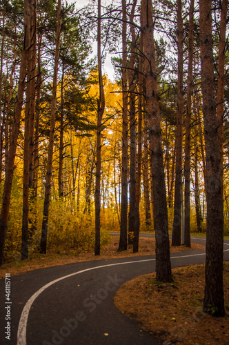 © vadim yerofeyev, Obraz premium asphalt road with beautiful trees on the sides in autumn