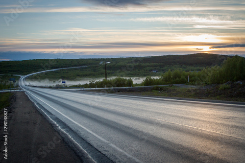 © Alexey Oblov, Fototapeta premium Asphalt road with fog on sunset.