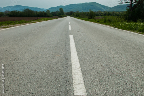 © varbenov, Naklejka premium Asphalt surface of country road closeup on countryside landscape background