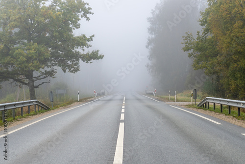 © Edijs, Fototapeta premium Asphalted road covered in fog