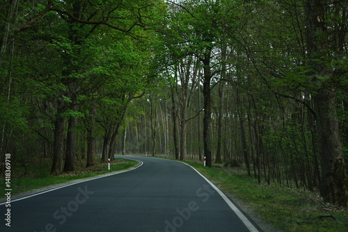 © Svitlana Kolycheva, Obraz premium Asphalted road in green spring forest