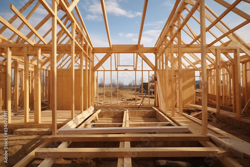 Obraz premium assembly of the wooden frames beams and trusses. Generative AI
