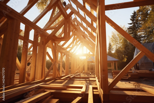 Obraz premium assembly of the wooden frames beams and trusses. Generative AI