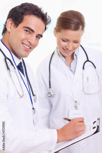 © WavebreakmediaMicro, Fototapeta premium Assistant doctors with patient record