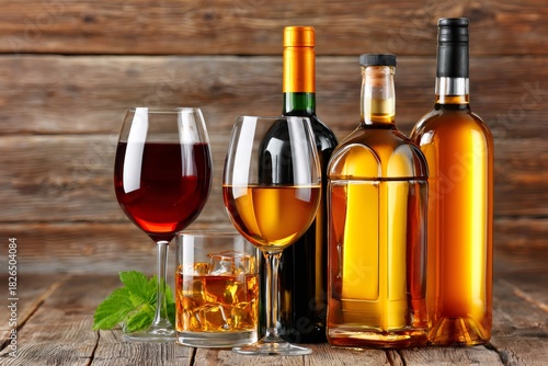 Fototapeta premium Assorted alcoholic drinks with wine and spirits on wooden table
