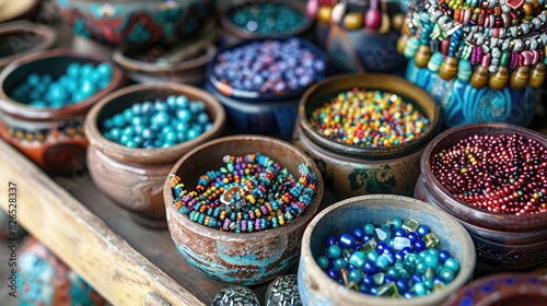 Fototapeta premium Assorted beads and handcrafted items in a container Crafting with embroidery and beadwork Handmade creations