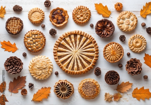 © ANUAR, Obraz premium Assorted Beautifully Crafted Pies Displayed with Autumn Leaves and Pine Cones on White Wooden Surface