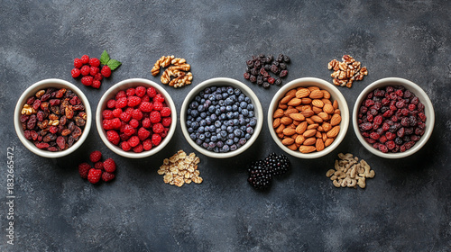 Fototapeta premium Assorted berries, nuts, and dried fruits arranged in bowls, creating a...