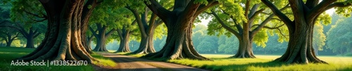 © Pimchada, Naklejka premium Assorted big trees with lush foliage and intricate bark patterns, timber, landscape