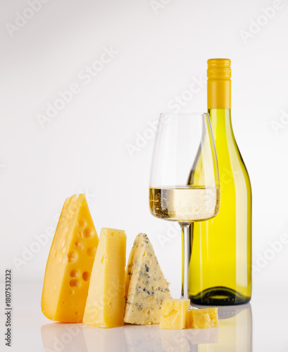 Fototapeta premium Assorted cheeses and wine bottle on white background