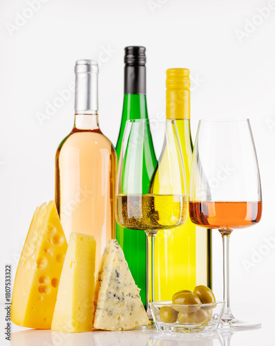 © evgeeenius, Naklejka premium Assorted cheeses and wine on white background
