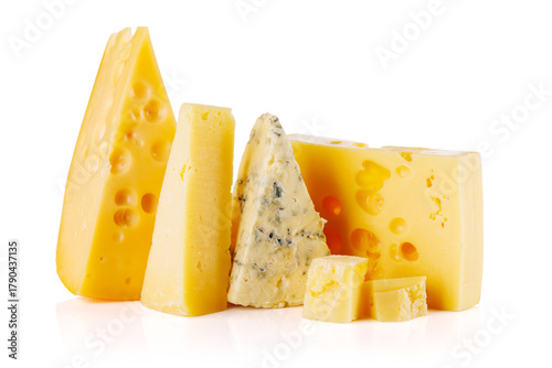 © evgeeenius, Naklejka premium Assorted cheeses on white background