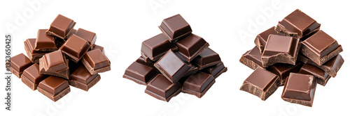 Obraz premium Assorted chocolate cubes in three piles on transparency background