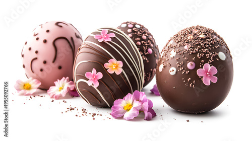 © Afroja, Obraz premium Assorted chocolate easter eggs with sprinkles and flowers