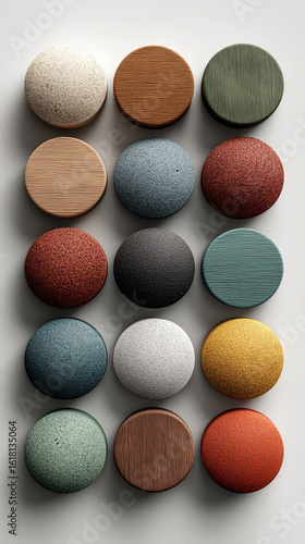 © Natalia Schuchardt, Fototapeta premium Assorted Colorful Ceramic Plates On Neutral Background: Artistic Arrangement Of Round Textured And Smooth Tableware In Warm And Cool Tones For Modern Kitchen And Interior Design Inspiration