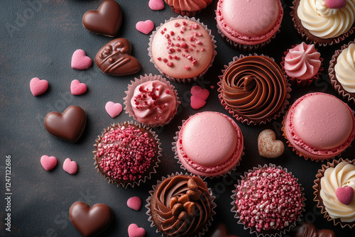 © Vladyslav, Obraz premium Assorted desserts with decorative chocolates and heart shapes on a dark surface for celebrations and indulgence