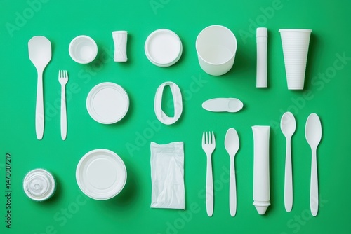 © Rahman, Fototapeta premium Assorted Disposable White Utensils and Containers on Green Background