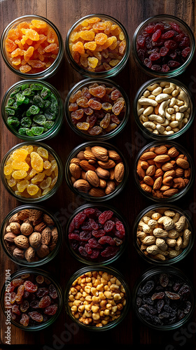 © emkos, Fototapeta premium Assorted Dried Fruits and Nuts in Glass Jars