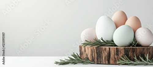 Fototapeta premium Assorted farm fresh eggs on wooden platter with rosemary sprigs against neutral background and copy space
