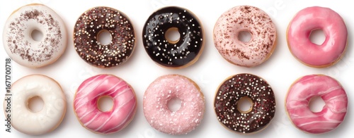 © Biru, Fototapeta premium Assorted glazed donuts with sprinkles and frosting