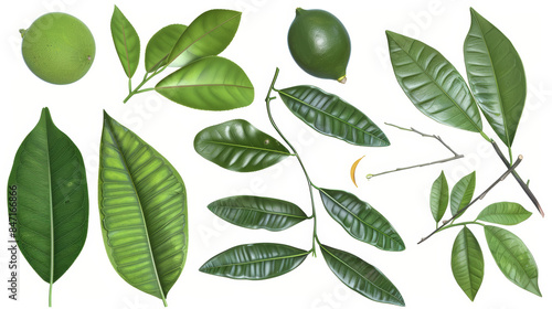 © woret, Naklejka premium Assorted green leaves and a sliced lime on a white background
