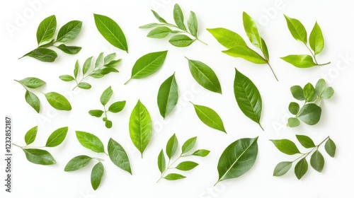 © Penatic Studio, Naklejka premium Assorted Green Leaves Arranged on White Background