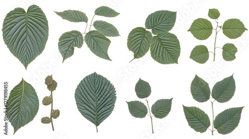 Fototapeta premium Assorted Green Viburnum Leaves in Varying Arrangement on White Background Displaying Natural Textures