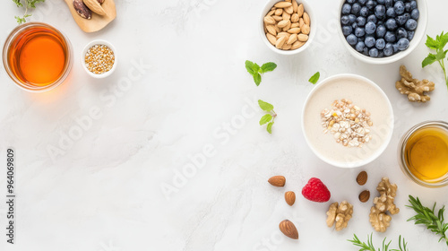 © M, Obraz premium Assorted healthy food ingredients displayed on a light marble surface, featuring nuts, berries, and oils for a nutritious lifestyle