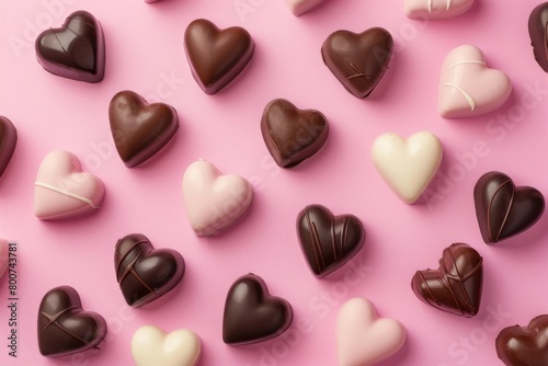 Fototapeta premium Assorted heart-shaped chocolates on a pink background.