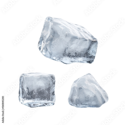 © ZeyBer, Obraz premium Assorted ice cubes of varying sizes on transparent background, ideal for cold beverages or cooling effects