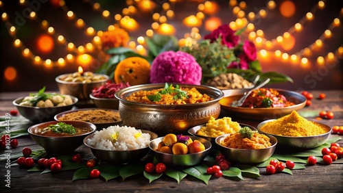 © Adisorn, Fototapeta premium Assorted Indian Dishes on Dark Background with Floral Accents for Diwali and Ugadi Celebrations, Featuring Colorful Bowls and Plates for Puja Ceremony