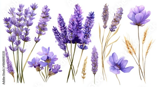 Fototapeta premium Assorted lavender flowers and wheat stalks on white background.