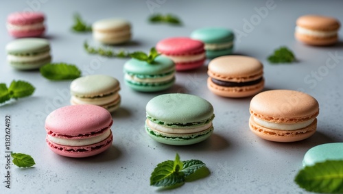 © GenZGraphics, Obraz premium Assorted macarons positioned with mint leaves on a light gray concrete backdrop. Perfect for holiday-themed food imagery featuring ample space for text.