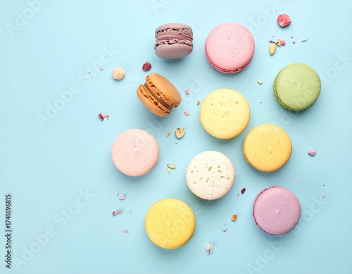 Obraz premium Assorted macarons scattered on a light blue background