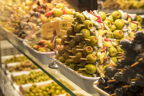 © chiyacat, Obraz premium Assorted Olives on Display in Mercado de San Miguel in Madrid Spain