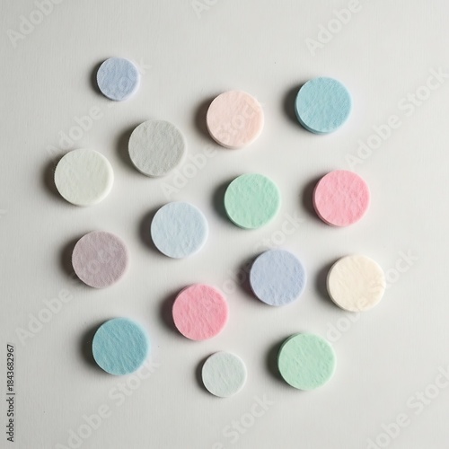 © Dalmon, Obraz premium Assorted pastel circles arrangement on plain background, minimalistic composition