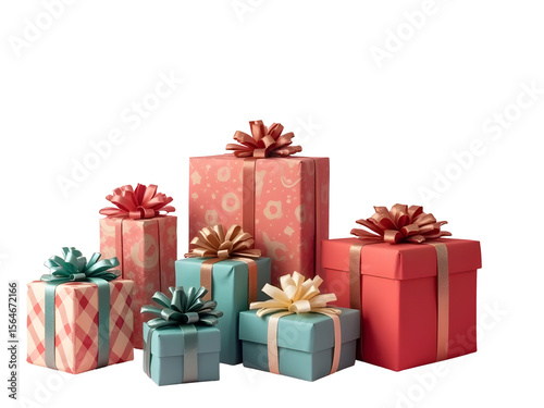 © Pro Video Store, Fototapeta premium Assorted Pastel Pink Red Blue Green Wrapped Christmas Presents with Bows Isolated on a Transparent Background