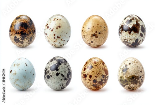 © Yothin, Obraz premium Assorted Quail Eggs Displayed White Background Various Speckled Patterns and Colors