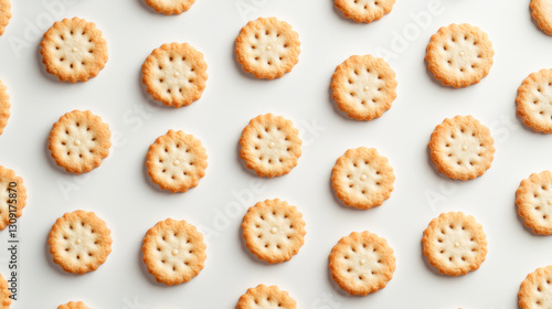 © romanets_v, Obraz premium Assorted round crackers pattern on light background displaying culinary design
